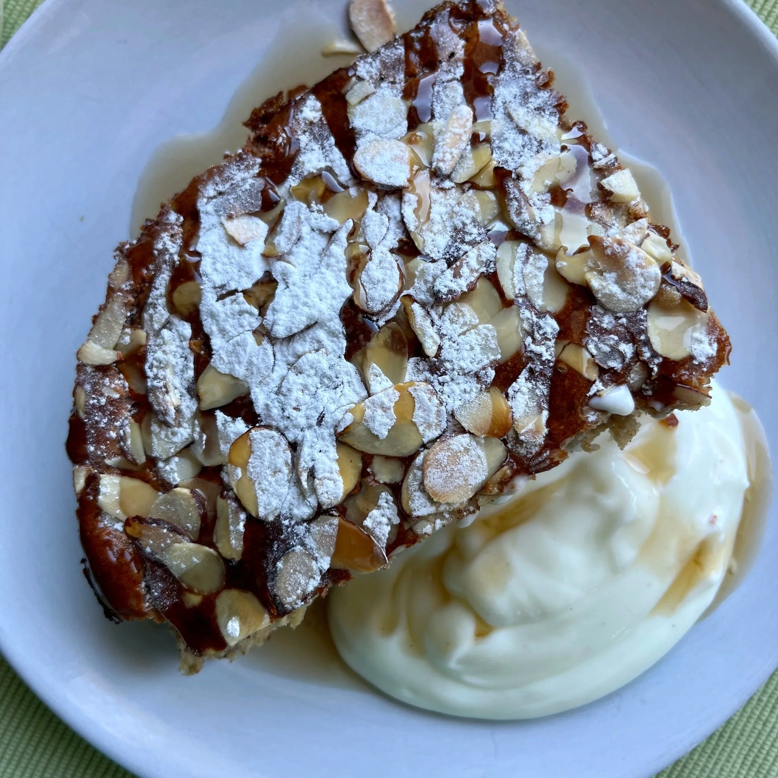 Once the oats have finished cooking, remove from the oven and allow to slightly cool. Then, spread the almond paste over the top and finish with the sliced almonds and a dusting of icing sugar.