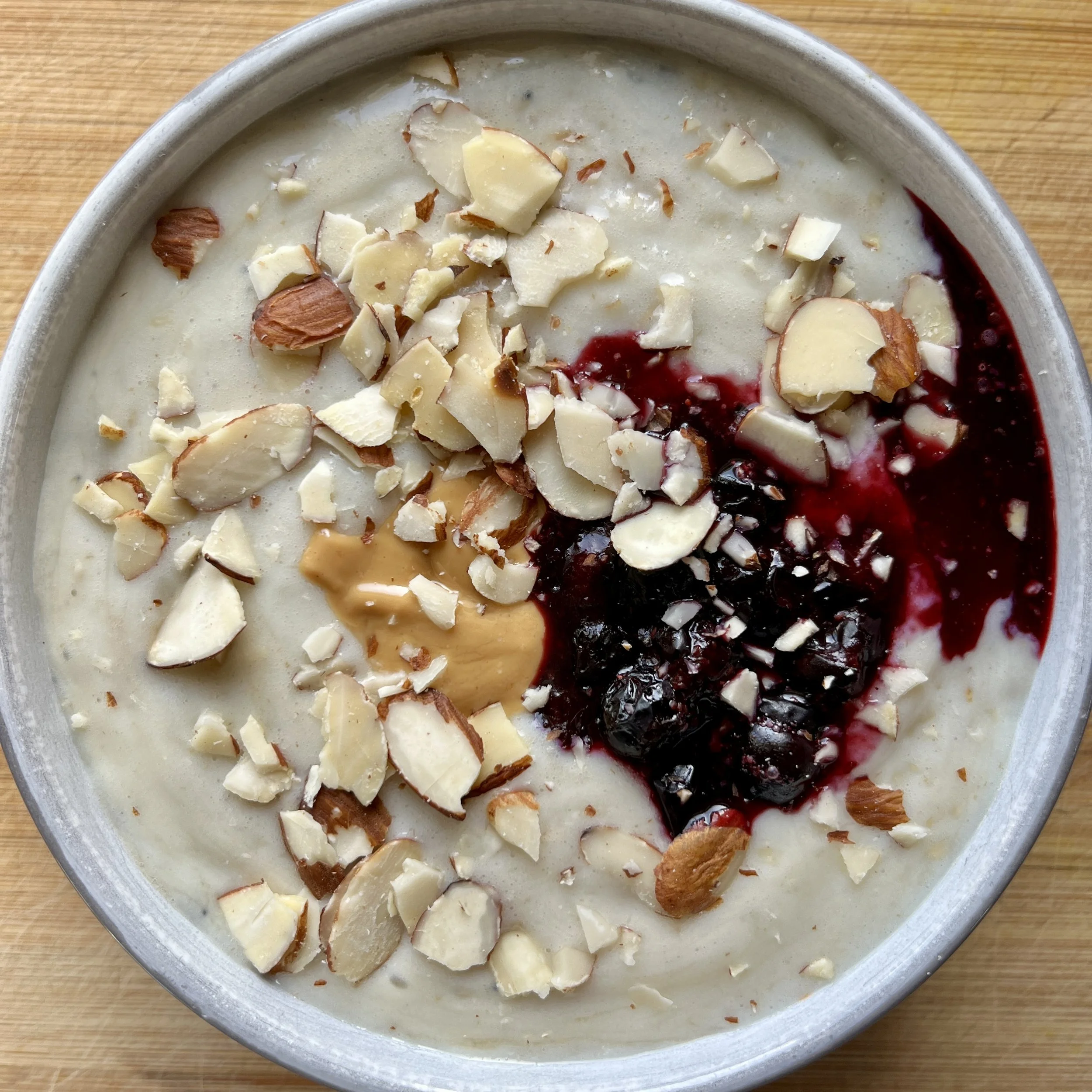 Place oats into a serving or meal prep bowl, then top with peanut butter, berries, sliced almonds.